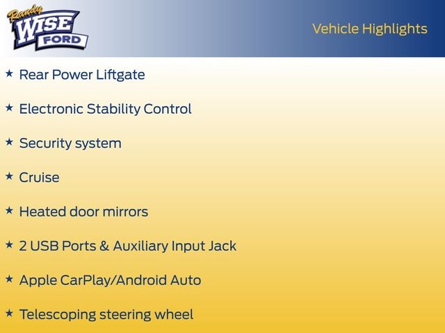 - 6 Speakers, SiriusXM Radio, Dual Zone Automatic Climate Control, Rear Window Defroster, Bluetooth®, Power Driver Seat, Power Windows, Remote Keyless Entry, Remote Start, Steering Wheel Mounted Audio Controls, Universal Home Remote, Speed-Sensing Steering, Traction Control, ABS Brakes, Rear Power Liftgate, Electronic Stability Control, Security System, Cruise, Heated Door Mirrors, 2 USB Ports & Auxiliary Input Jack, Apple CarPlay/Android Auto, Telescoping Steering Wheel, Tilt, Heated Driver & Front Passenger Seats, Split Folding Rear Seat, 17 Aluminum Wheels