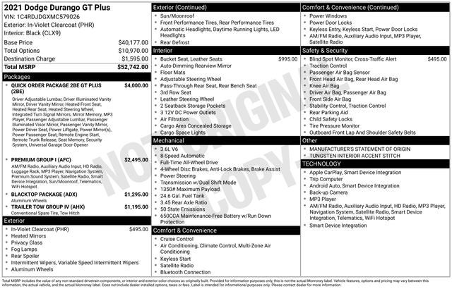Presenting a meticulously maintained 2021 Dodge Durango GT Plus, a versatile and powerful AWD SUV designed for comfort, performance, and advanced technology. Finished in striking In-Violet Clearcoat with a refined black leather interior, this Durango combines style and functionality for both daily driving and family adventures.